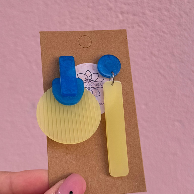 Brincos em forma assimétrica, com texturas diferentes e relevos diferentes.