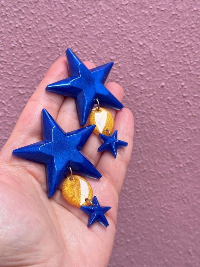 Brincos Estrela, tamanho XL e assimétricos.