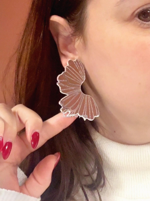 Brincos Flora em acrílico espelhado prateado, perfeitos para oferecer e para usar em eventos cheios de glamour.